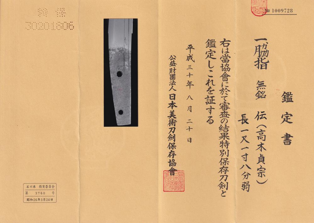 証書 : 財団法人日本美術刀剣保存協会