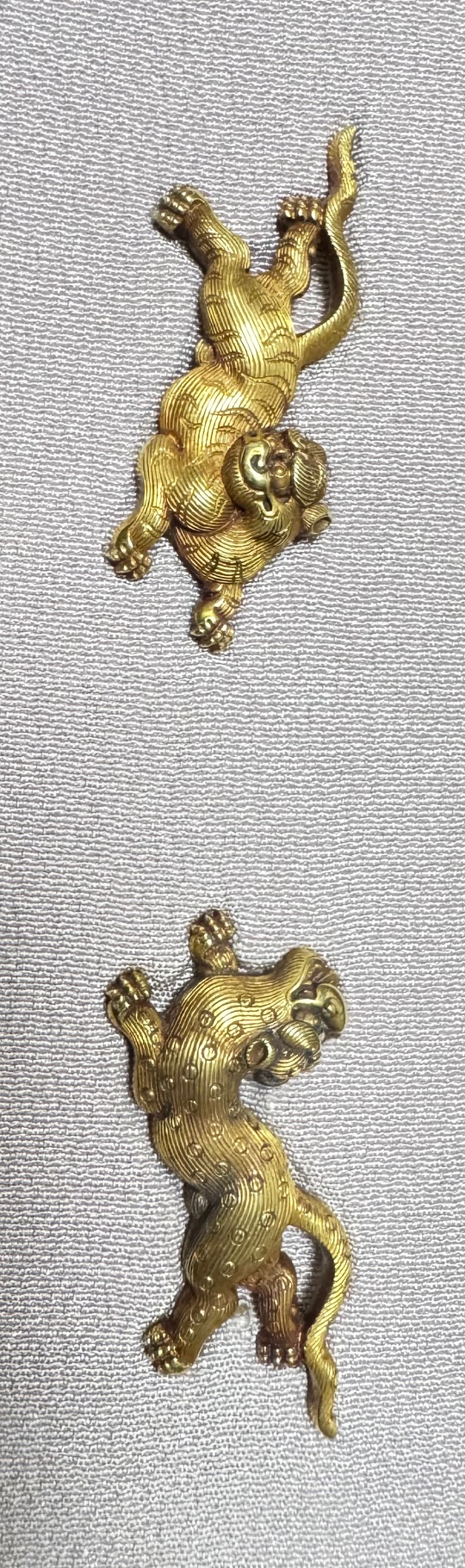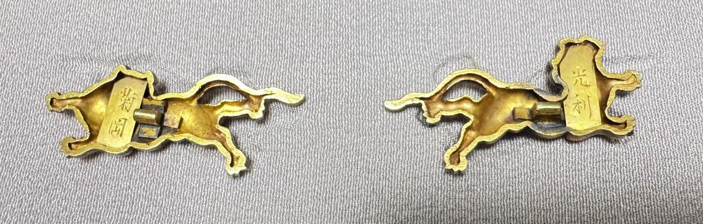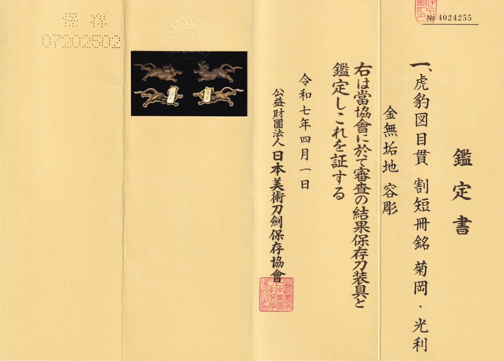 本作は菊岡光利の金無垢の虎豹図の目貫です。戦国時代から江戸時代初頭に狩野派などによって描かれた屏風絵や襖絵、障壁画などに虎図の中に豹の姿がみられます。これは虎や豹の実物を見たこともない中で、 当時の常識として、「豹は雌の虎」と考えられていたのではないかということのようです。虎豹は強さ、勇猛さの象徴であり、武人には好まれて図柄です。裏側を見ると、「菊岡」「光利」としっかりした割短冊銘があり、横谷・柳川・菊岡と続く町彫主軸の力量を感じさせる光利の優品です。