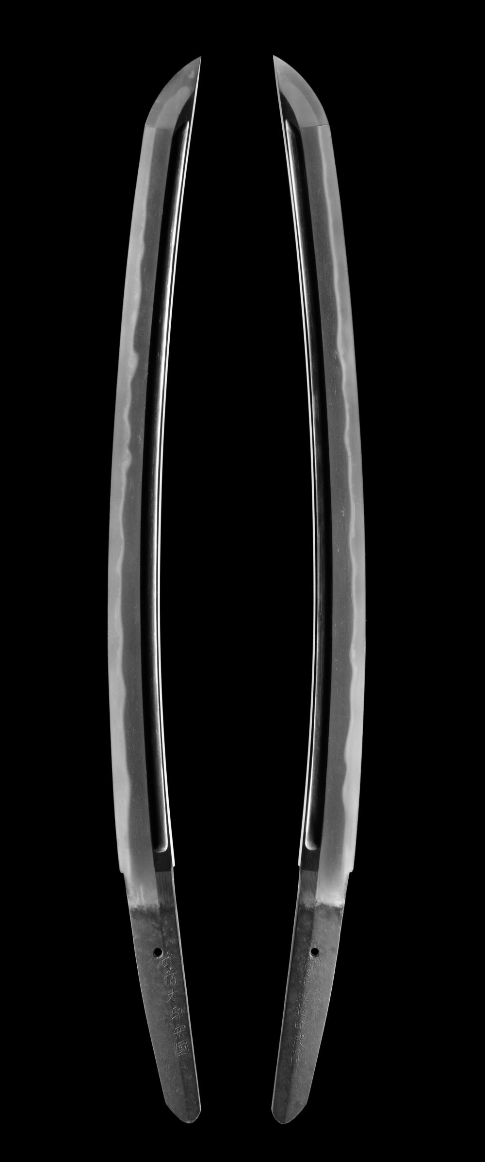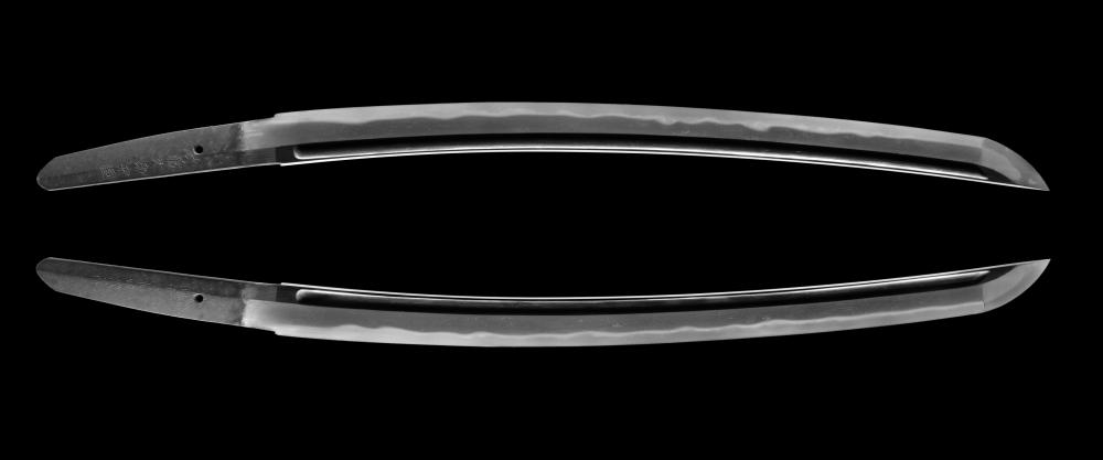 本作は鎬造、庵棟、元幅39.2mm、重ね9.2mm、中切先延びる豪壮な体配で、地鉄は小板目詰み、刃文は直ぐ調に焼き出して、のたれに小のたれを主体として、上半に行くにつれ、特に差し表は互の目に尖り互の目、逆がかった足など入り、飛び焼きよく入り、皆焼風の刃になっています。帽子は直ぐに丸く返り、先沸つく出来です。豪壮な刀がお好きな方にお薦めの一振りです。