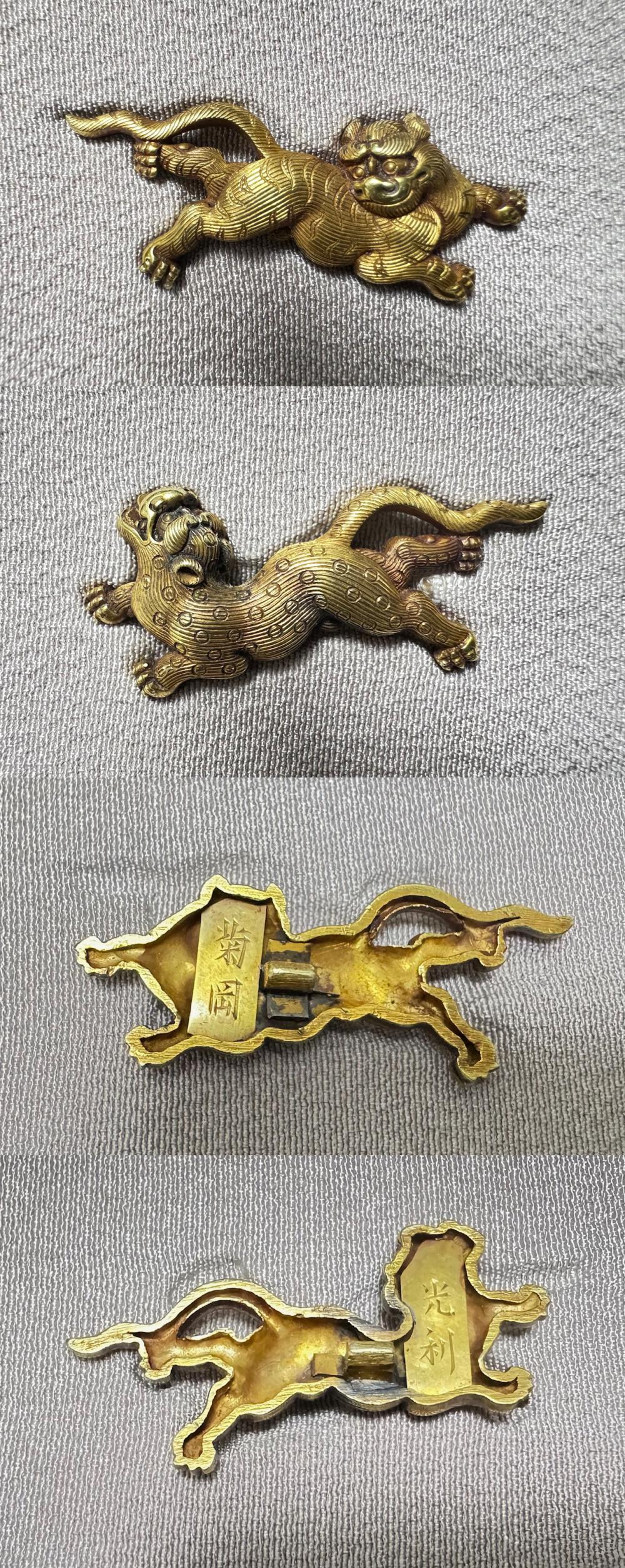 本作は菊岡光利の金無垢の虎豹図の目貫です。戦国時代から江戸時代初頭に狩野派などによって描かれた屏風絵や襖絵、障壁画などに虎図の中に豹の姿がみられます。これは虎や豹の実物を見たこともない中で、 当時の常識として、「豹は雌の虎」と考えられていたのではないかということのようです。虎豹は強さ、勇猛さの象徴であり、武人には好まれて図柄です。裏側を見ると、「菊岡」「光利」としっかりした割短冊銘があり、横谷・柳川・菊岡と続く町彫主軸の力量を感じさせる光利の優品です。